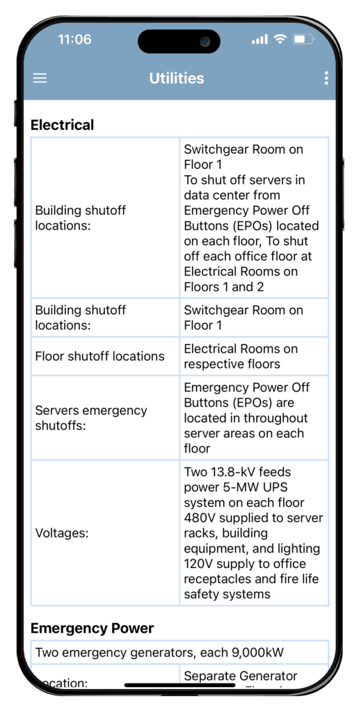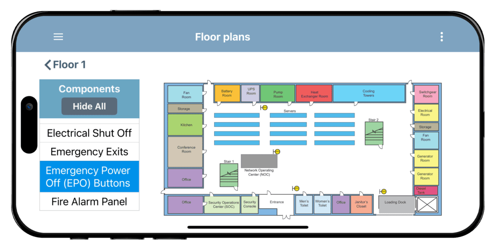 - Interactive floor plan schematics to identify all of the critical equipment and servers